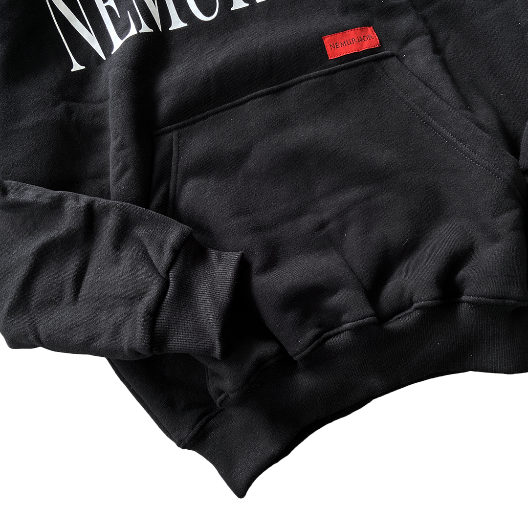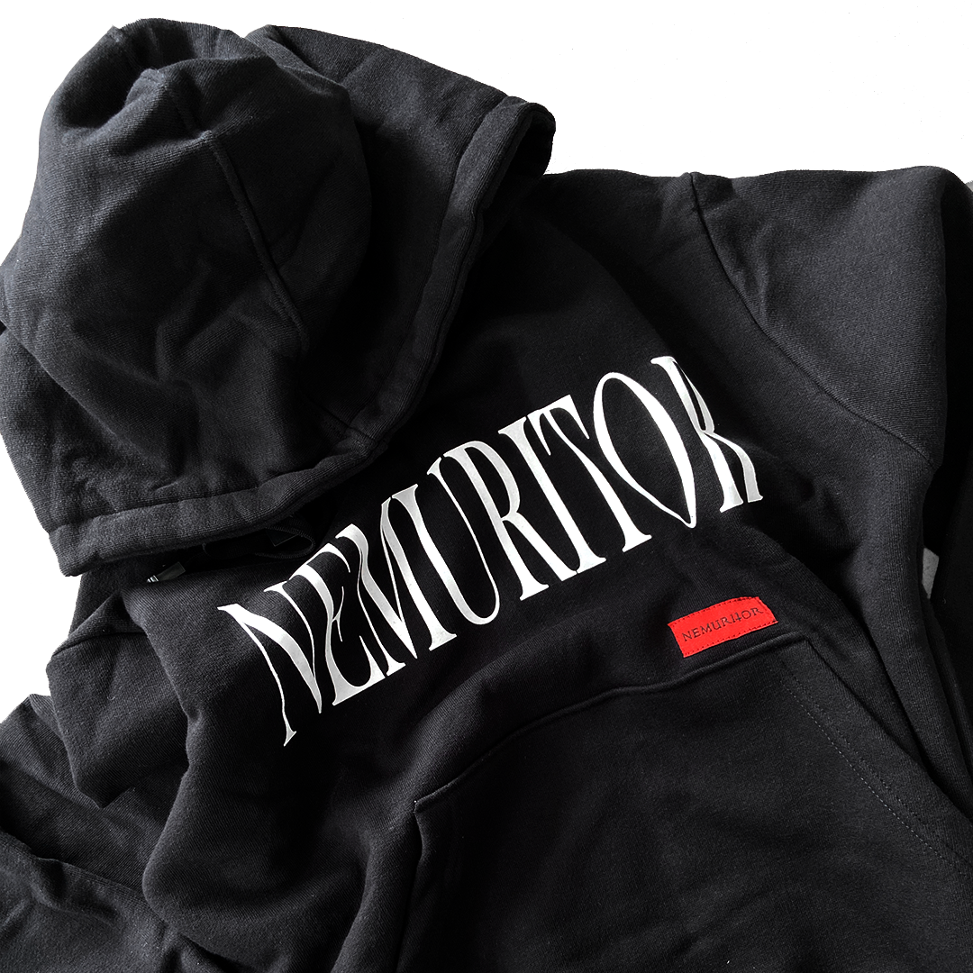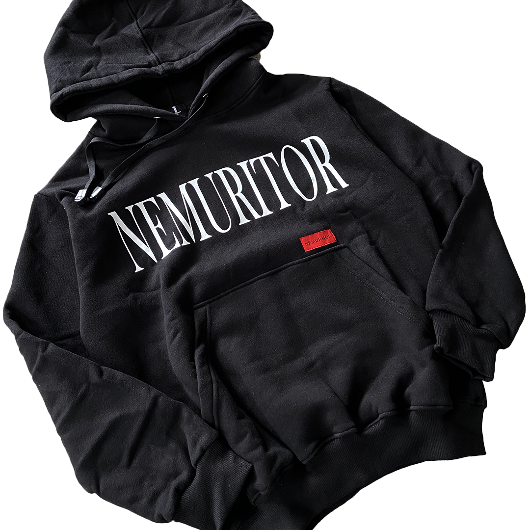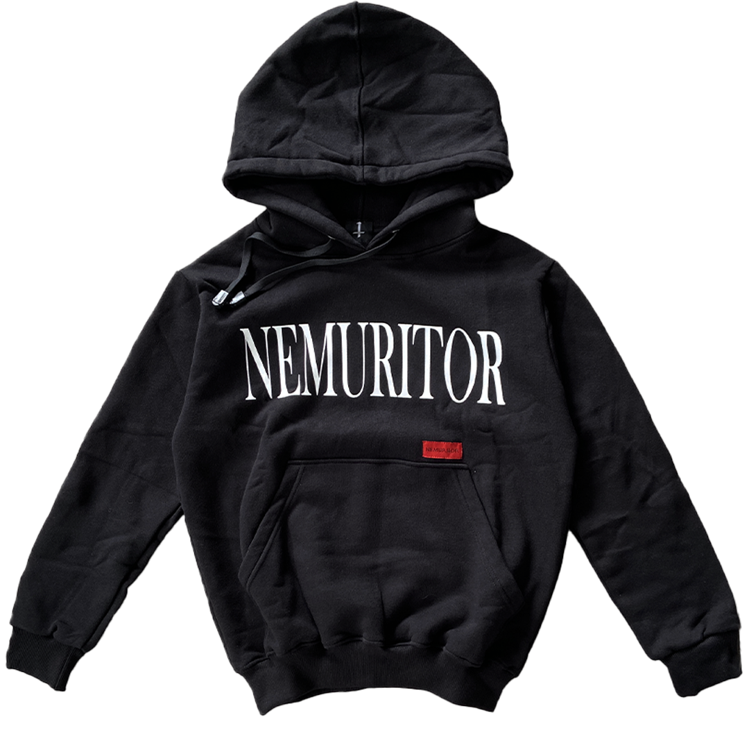 A minimalist statement piece. This basic hoodie features the iconic Nemuritor font elegantly printed on the front, offering a clean yet bold look.