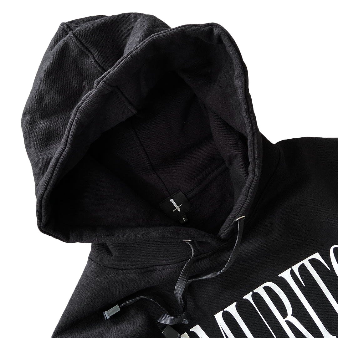 Black regular hoodie with 330 gsm fleece cotton. Screenprinted plastisol ink on the graphics.