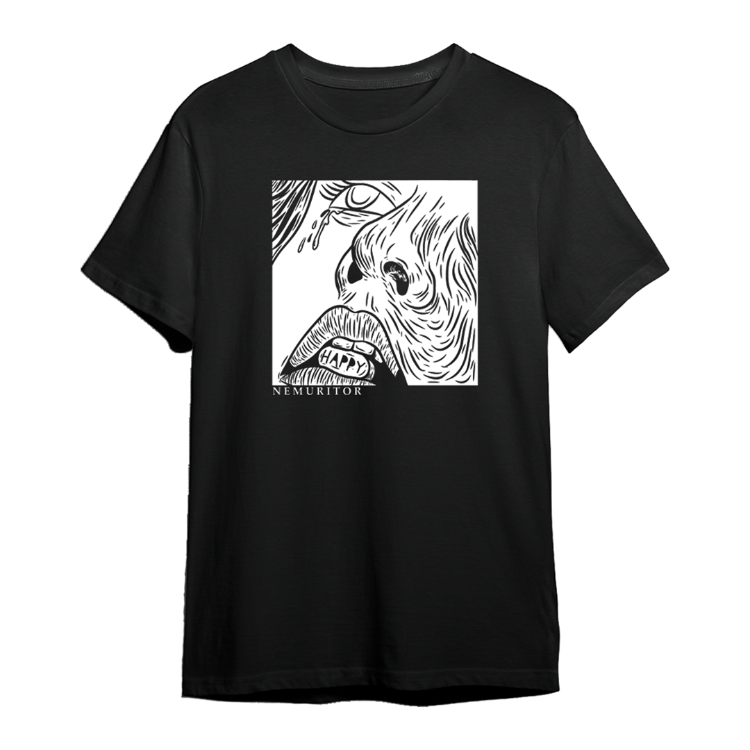 Black regular fit shortsleeve t-shirt with 200 gsm cotton. Screenprinted plastisol ink on the graphics.