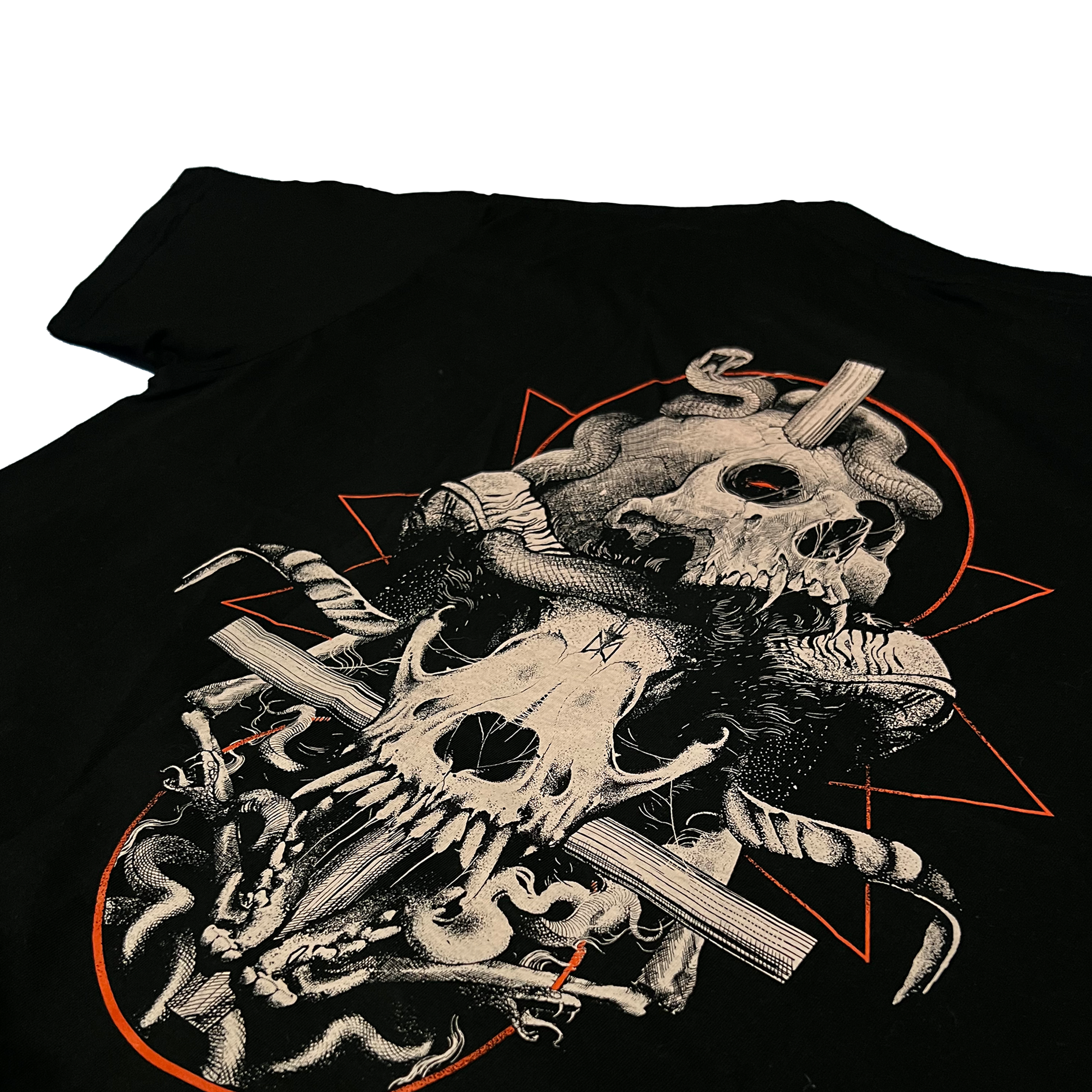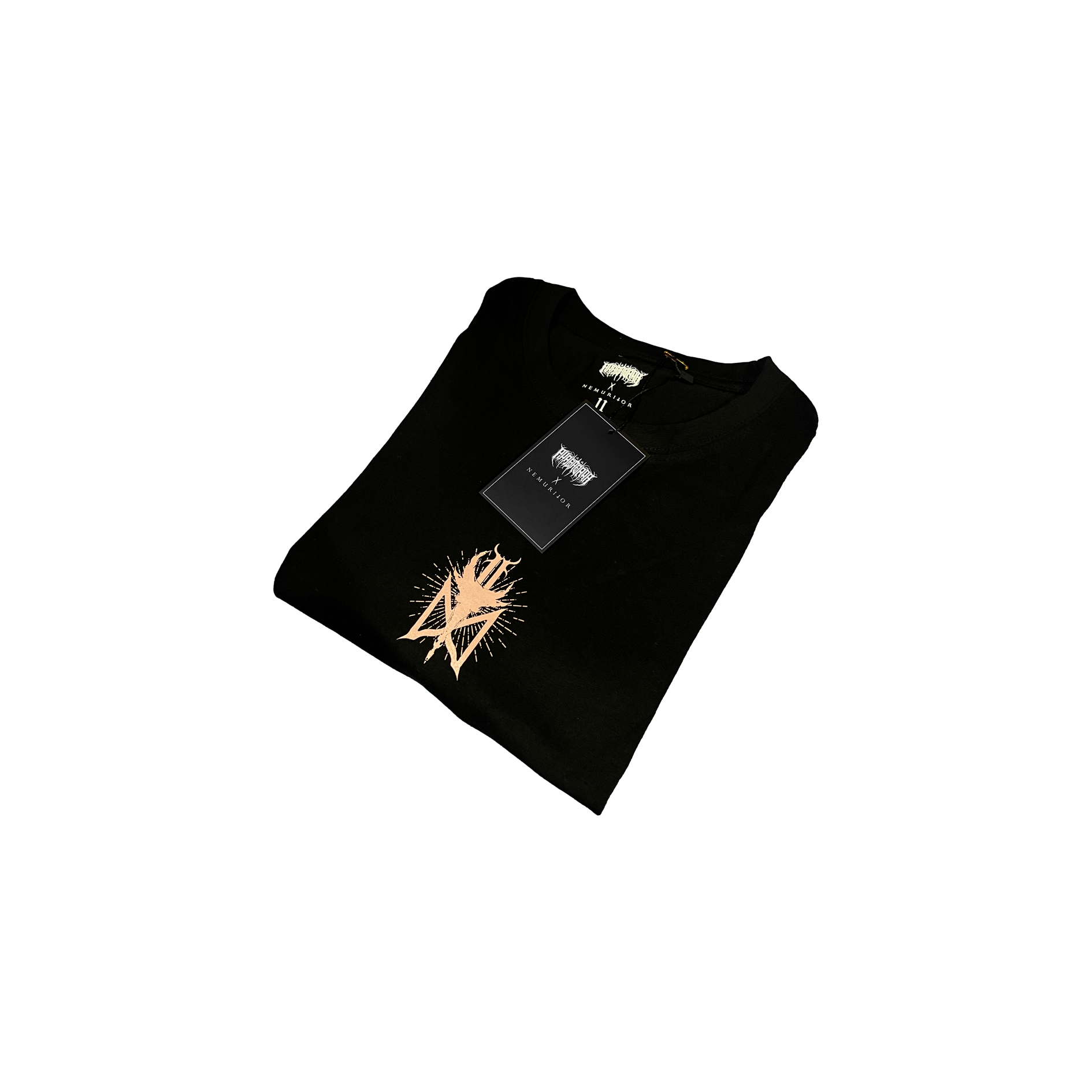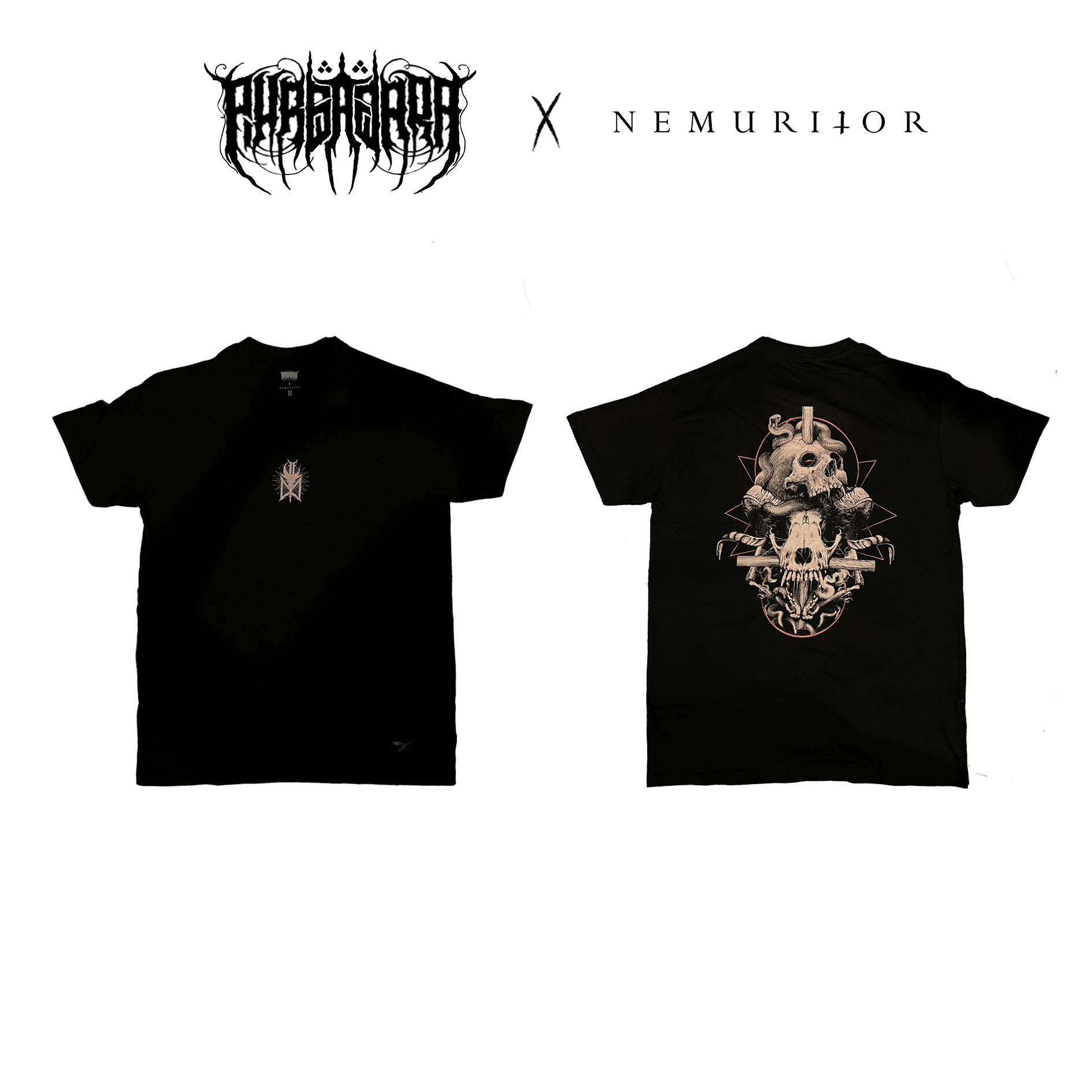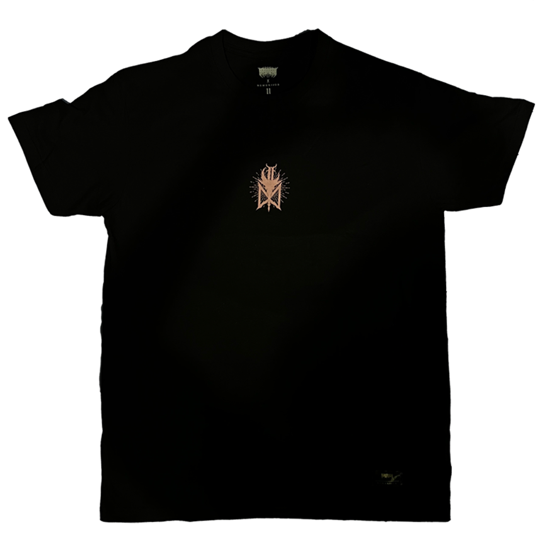 Black regular fit short sleeve t-shirt with 180 gsm cotton. Screenprinted plastisol ink on the graphics.